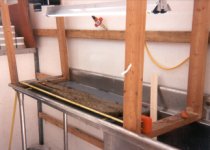 Processing facility set up in a box truck for core photography, logging and sub-sampling. Note the track- mounted camera.and lights.